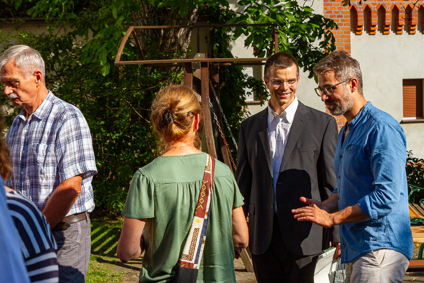 Nach dem Gottesdienst feierte die Gemeinde im Pfarrgarten weiter bei Kaffee und Kuchen, mit vielen Gesprächen untereinander und mit dem neuen Pfarrer. Auch einige Weggefährten aus Alex' vorheriger Stelle im Mehrgenerationenhof Burtschütz waren gekommen und begleiteten ihren Freund und seine Familie in die neue Aufgabe.